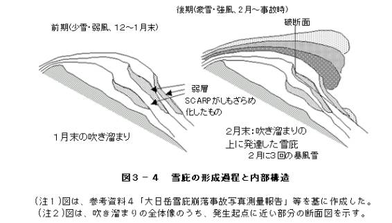 雪庇の下方 (堆積した積雪層の底のほう) 10メートルもの位置にしもざらめ化した弱層があって、それが原因で雪庇が崩落した事例は今まで報告がなく、山岳関係者も雪氷研究者も体験したことのない特異な現象と考えられる。」