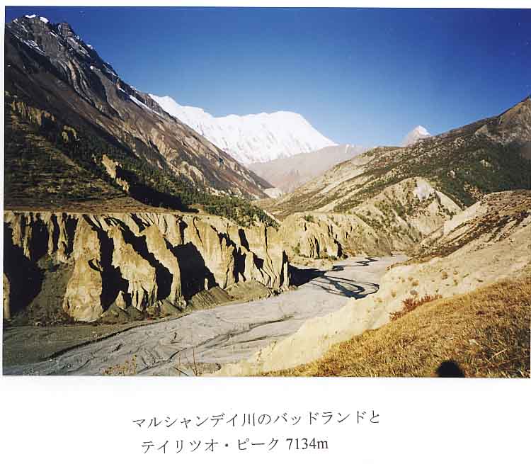 「ピサンのさきに、ちょとした峠があって、それを越えると、又平坦な、高原状のところがずっとおくまでつづいている。いちばん奥に、カリ・ガンダキとの分水嶺の山が見えてきた。山すそにバッドランド地形が現れて、景色は一段と荒さを増した。」