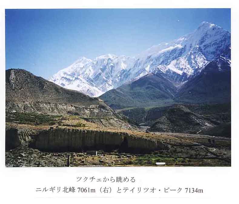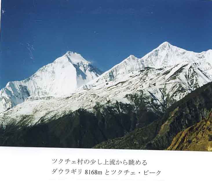 テイリツオからマナンには降りずに、直接3890mのグンサンへ行き、一日休養。グンサンからもアンナプルナ2峰、4峰、3峰、ガンガプルナが手に取るように望めた。4450mのトロンペデイには大きなロッジが三軒もあった。早朝3時半にヘッドランプをつけてトロンペデイを出発。ロッジからはザラ場の急登だが、月明かりもない闇の中を足を動かしてただ歩くのみ。気温はマイナス6-7度なので、汗はかかずに歩けて有り難い。ポーターの一人のプルマが遅れだす。どうも高度障害が出てきたようだ。ガイドのジット君と他の二人のポーターでプルマの荷物をダブル・ボッカして登るという。私達5人は割と快調にトロンパス5415mに8時に到着。峠のバッテイでミルクテイーを飲んでポーター達を待ったが、風もきつくマイナス15度に温度が下がってきたので、下のバッテイで待っている旨のメモを残し、ムクチナートに下山を開始した。チャブルのバッテイでラーメンを食べて一服。ちょうど1時間遅れでガイドとポーター3人が降りてきて合流。大事なくホットする。その晩はラニポクのロッジに泊まったが、昨日までの快晴が嘘のように雨が降り、翌日の朝には4000m以上は積雪で真っ白になっていた。カトマンズを出て以来、丸2週間ずっと快晴続きであったが、私達がトロンパス越えてから、天候が悪化したとは本当にラッキーであった。ラニポクをでて暫くすると小雨も止んだ。振り返ると、ジャルコットの城塞のような古い街が、紅葉の高原に浮かんでいる。晴れていればカクベニのすぐ上の平らな広い丘から真正面に見えるはずのダウラギリ主峰は、今日はガスで全く見えず。一昨年秋ダウラギリに登りに行った宮川清明さんは、期待していたダウラギリが見えずがっくり。カクベニでは、3年前にお世話になったニュー・エシア・ホテルに投宿。御主人のペマさん、奥さんのニマさんと再会を喜びあった。長男も、長女も現在は東京で住んでいるとの事。以前と同じように、掃除が行き届いた清潔なロッジに2日間滞在した。カクベニで休養をとった後、ジョムソンの博物館をみて、マルファ泊まり。50年前にマルファを訪れた川喜田二郎さんは、「売春婦の街」とその著でマルファを紹介されているが、今はそんな気振もない白壁のきれいな街道町である。ツクチェの手前から、ツクチェ・ピーク6920m、そして1960年にスイス隊(マックス・アイゼリン隊長)が初登頂し1970年に同志社大学隊(太田徳風隊長)が第2登を成し遂げたダウラギリ8167mの北東稜が紺碧の空に聳えていた。マルファからツクチェ迄わずか2時間の行程だが、その日はツクチェ見物とした。スニル・ゲストハウスのプラサドさんは相変わらず元気だったが、この2年間で更にトレッキング客が減ってツクチェ村は一層寂れてしまったと嘆くことしきり。チベット交易が盛んだった時代はタカリー族の中心地として3000人ほどの人口だったツクチェは、今や人口たった700人の由。チベット交易もすたれ、マオイストの影響でトレッキング客も減り、更にツクチェを飛び越えてジョムソン迄飛行機で行くムクチナート巡礼者やトレッカーが増えて、ツクチェは見捨てられた村になり、空屋だらけになってしまったとの事。河口慧海の泊まっていた部屋を再度見せていただきたいとカルパナ・セルチャン夫人を訪ねる予定をしていたが、セルチャン夫人も息子さんの住んでいるロンドンへ既に引っ越してしまったらしい。ツクチェの街自身は、以前よりは掃除が行き届いて清潔になっていたが、何だか閑散とした寂しい状況であった。
