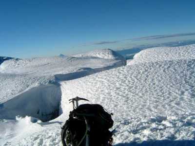 主峰へはクレバスがあり、登れず。バ−ニョス温泉泊
