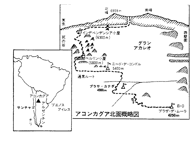 9時インディペンデンシア5800mに到着。先行パーティーが休憩している。最近はベルリンの上のC3がよく利用されているようだ。Piedras Blancas(6000m)と呼ばれるキャンプ、ポーランドルートから廻り込むルート上の6200m付近など、かなり一般的に利用されているとのこと。平坦地で残雪があれば、水が得られ、テントが張れ、泊れる。先行組はC3からの出発組だ。