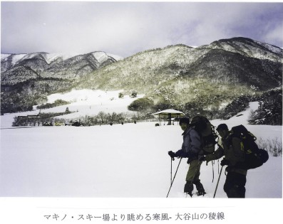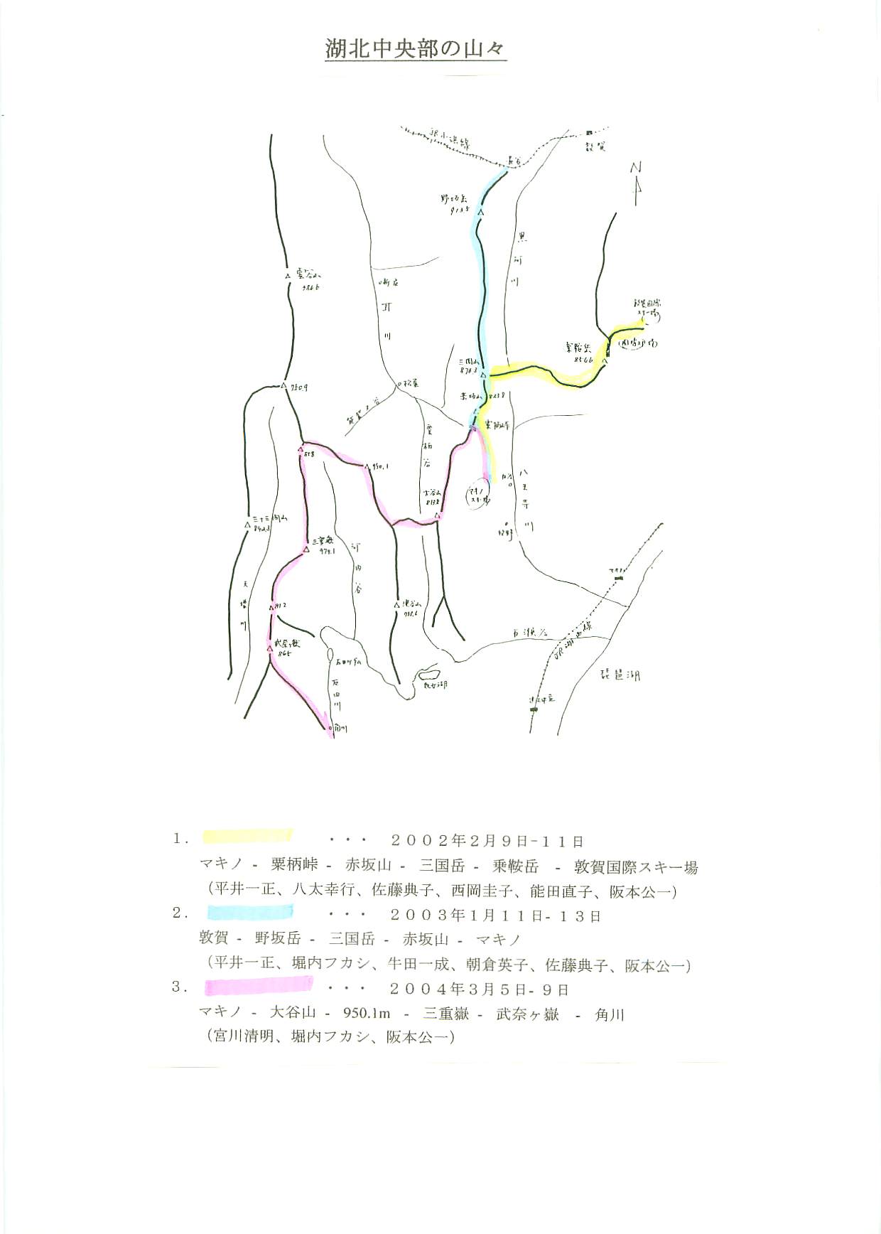 2002年2月にマキノから粟柄峠に登り、赤坂山、三國岳から乗鞍岳へと縦走して敦賀国際スキー場におりる3日間のラッセル山行を楽しんだ(メンバー:L阪本公一、平井一正、八太幸行、佐藤典子、能田直子、西岡圭子)。昨年の2003年1月11日ー13日には豪雪の若越国境尾根を敦賀の野坂岳から、三国岳、赤坂山に登って粟柄峠からマキノへ下山する縦走を行った(メンバー:L阪本公一、平井一正、堀内潭、牛田一成、朝倉英子、佐藤典子)。今回の縦走は、そのつづきの尾根であり、最も奥深い山域への長いラッセル山行である。このヤブ尾根の完全縦走が成功すると、この山域の主な稜線を踏破したことになる。今回のメンバーは、京都山岳会の宮川清明さん、AACKの堀内潭さんと私の3人。2004年3月5日に、実働4日・予備2日の食糧を担いで、勇躍出かけた。