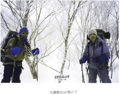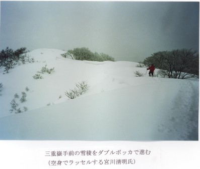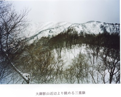 昨夜は強い風と雪が降りしきり、夜中に交代で、何度かテントの周りを除雪した。昨日からの新雪は40-50cm。5時に起床するも、雪は未だ激しく降っており、視界は極めて悪い。荷物を準備し終わり、テントの中で約1時間待機した。ガスが晴れだしたので、8:10にテント地を出発。南西の方に三重嶽がかすんで見えだした。だらだらした広い尾根を約40分ほど登ると大きなパネルアンテナが立っている950.1mのピークに着いた。「大御影山」と書いた手書きの標識が立木にかけてあった。河内谷から沢をつめてこの山に登る登山道が出来たのだろうか? 大御影山950.1mから南南西の方向に、三重嶽が雲間から姿を見せた。大御影山からは、稜線はやせた尾根となって北北西の方にのびている。左手にでる雪庇に注意しながら、ブッシュを縫うように下る。コルから、尾根は今度は少し南南西にのびて780mのピークへの登りとなる。このピークをおりると、今度は尾根は再度北北西に変わる。稜線がクネクネと曲がっていて、複雑きわまりない地形だ。ここからジャンクション・ピーク迄の登りは、次から次へと小山があらわれ3時間強の厳しいラッセルの登りであった。遙か北の雲谷山786.6mからくる尾根とのジャンクション・ピークには、「三重嶽入り口。登山道未整備」の標識が立木にぶら下げられていた。その横の立木に巻いた黄色と黒のテープにH15/11/24とマジックインキでの書き込みがあった。北の耳川の支流能登又谷から北方稜線に上がる夏道を、三重嶽まで延長させようとの試みがなされているのだろうか?このジャンクション・ピークから我々は進路を南にとり、三重嶽を目指す。風雪が又激しくなり出した。北西の強い風が吹き出し、気温も急速に下がってきた。西高東低の冬型気圧配置になってきたらしい。少し早いがジャンクション・ピークの次の858m峰の広い林の中に幕営した。