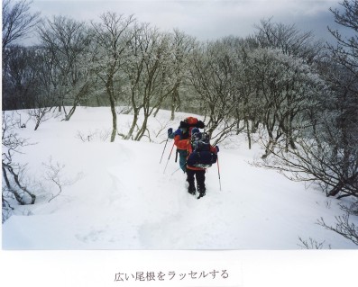 昨日昼頃から降り出した雪は、その後も降り続けた。夜半に30-40分間だけ雪が止みおぼろ月がでていたが、又本格的な激しい降雪となり朝まで降り続いた。昨日は予定していた三重嶽まで行き着けなかったので、今日は少し天気が悪くとも行動することにした。昨日来の雪は60-70cmも降り積もっており、新雪のラッセルにあえぐ。重荷を担いでの膝からもも迄のラッセルは、疲労が激しくスピードも極端に遅くなる。出発して30分ほどしてからは、トップが空身で50-60歩程ラッセルし、後の二人が荷物を担いでつづくダブルボッカ形式で進む事にした。速度は遅いが、体力の消耗は随分楽だ。ピーク889mは広い尾根が南西にのびているが、これは天増川の方におりている尾根だ。1998年10月に石田川河内谷をつめて三重嶽を登ったときは、この南西尾根をおりてしまって随分と時間のロスをした。三重嶽につづく稜線は南南東に下る細い尾根だ。5年前の記憶を思い出していると、ガスが突然切れて、どっしりした三重嶽の前衛峰が見え出した。南南東の尾根を空身で少し下って再確認をした後、全員そろっておりる。キーポイントになる箇所を無事通過できホットする。コルからは、又ダブルボッカでラッセルに継ぐラッセル。空身でも、もも迄の登りのラッセルはきつい。ピーク943mを越えると大きな樹林がなくなり、尾根筋に雪稜があらわれてくる。小さいが東側に雪庇がでているので、稜線の西側のブッシュがらみに登る。しんどい膝からモモのラッセルがつづく。三重嶽前衛峰は灌木もまばらになり、真っ白なだだ広い尾根となって前方に立ちふさがる。実に気持ちよい登りだ。前衛峰の上に登ると、広い尾根はコの字型になっており、対岸に大きなブナ林の三重嶽本峰974.1mが姿を現した。広い尾根は傾斜は殆どないが、ラッセルは深い。相変わらず、ダブルボッカ形式で、三重嶽頂上を目指して、尺取り虫のように進む。空身でトップを歩いていた堀内さんが「頂上の見晴台があるぞ」と喜びの声を上げる。13:00ようやく三重嶽頂上に登頂。マキノから歩き出して、4日目、長い長いラッセルだった。既に予定よりかなり遅れており、明日からは予備日をくいつぶす事になるので、今日は、出来れば武奈ヶ嶽との中間地点まで足をのばしておきたい。三重嶽登頂の喜びもそこそこに出発。三重嶽からは、広い尾根は傾斜の緩い下りとなるが、荷物を担いでのラッセルは無理。ダブルボッカ形式を続けて広い尾根を南西に進む。855mへの登りかえしはきつかった。武奈ヶ嶽への尾根が、真南に急傾斜で曲がる所は非常に間違い易い箇所なので、この斜面をおりきってから幕営したかったが、全員かなり疲労がたまってきたので、屈曲点の少し手前のブナ林の中で幕営した。