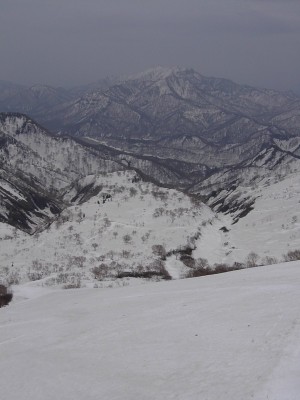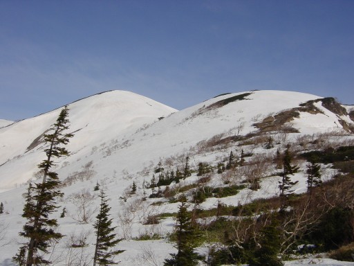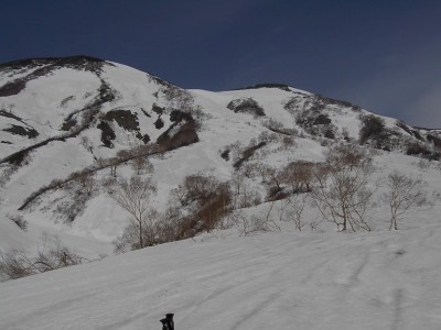 影火打とのコルからの斜面。背後は乙妻、高妻。