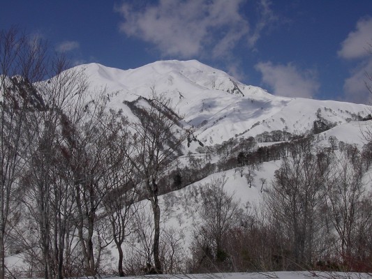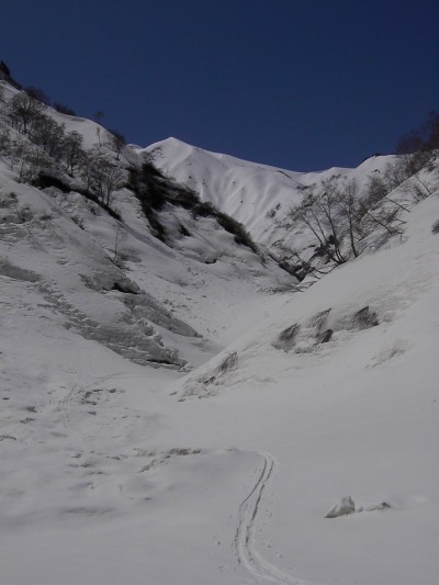 尾根からすぐに北側の白沢へ滑り降りた。ここも昨日降った雪が滑ると雪崩れたが、重く遅い雪で量も大したことなく問題はなかった。