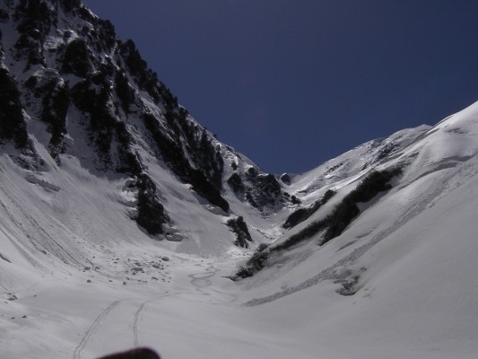 左右からブロックがいつ落ちてくるかわからない状況が続き、おちおちしていられないので、谷の様子や滑りの写真がほとんど取れなかった。