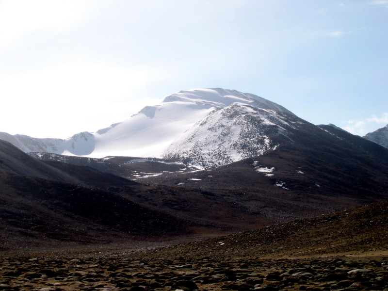 3 対象の山: タクラマカン砂漠の西南端の町イエチェンを起点に、チベットのラサへ向かう「新蔵公路」の、奇台逢坂(峠)を下り切った地点から公路を離れ、砂漠の中を東に直線距離にして約16キロのところにこの山は在る。正確には 北緯35度41分、東経79度40分 に位置する 高さ6,345mの独立峰である。 周りの6,000m級山群の中で一番高い。