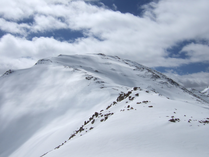 ここまで登るとピークに至るルートの全貌が見えてきた。案ずることはない。左からの雪稜とのジャンクションピークまで、このまま尾根通し問題無く行ける。ややこしい登攀用具の出番は無さそうである。ジャンクションピークから本峰まではなだらかな雪のプラトーが続く。本峰は見えないが、あのプラトーの奥にこんもりと鎮座しているのだろう。