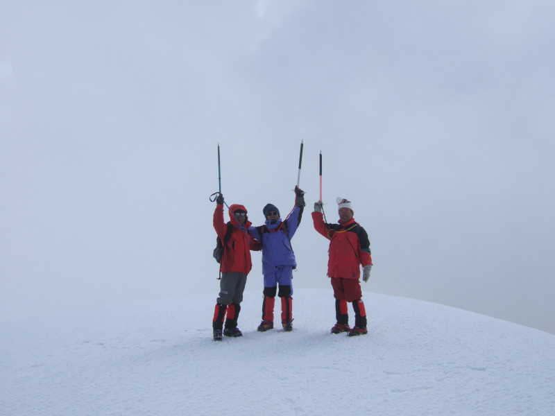 突然右側の前田から「伊藤さん、その先は落ち込んでいるから注意してください」と声が掛かる。ガスの中確かめると前後左右ここより高いところは無い。頂上であった。 打ち合わせどおり、一番高いと思われるところに直径1mの円を描き、アインス、ツバイ、ドライで4人同時に円内に足を踏み入れた。