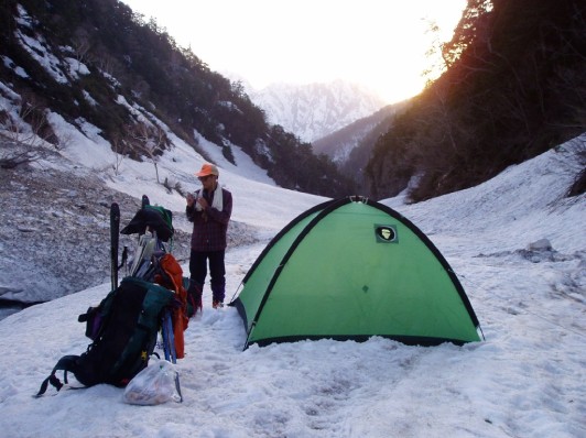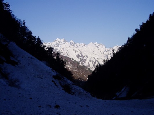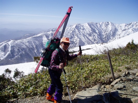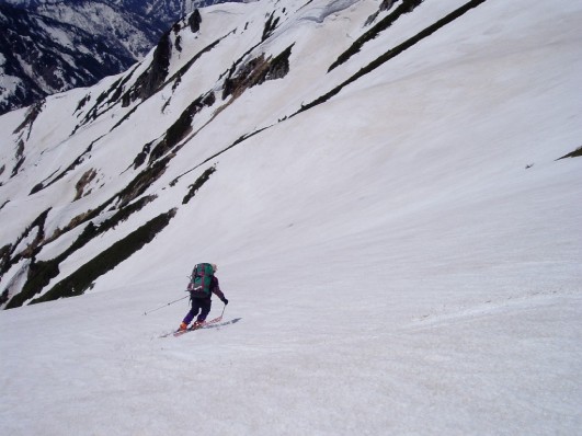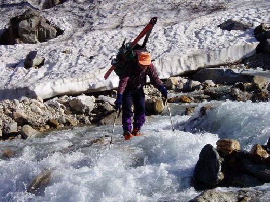 しかし、鹿島ウラ沢手前から雪が少なくスキーは使えず、渡渉を強いられるようになり、 片方のストックは渡渉中に流され、靴はびしょぬれ、雪が無くなった部分のへつりは微妙でアイゼンを使わされました。雪が薄くなっていて深い落とし穴に落ち込んでアイゼンの爪が曲がるなど苦労の連続。