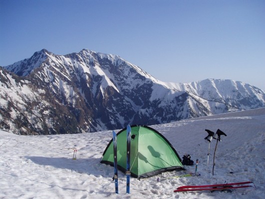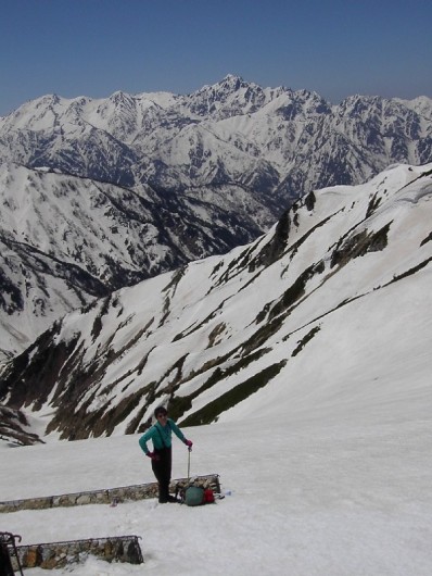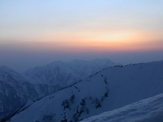 八方スキー場 八方池山荘8:08−後立山主稜線11:15−唐松小屋発11:30−餓鬼谷滑降−1969m11:45〜12:05−白岳北のコル13:45−五竜小屋14:15〜14:35−五龍岳15:45〜16:02−五龍南面滑降−東谷1603m18:00