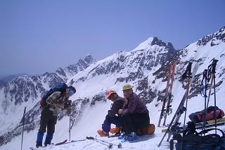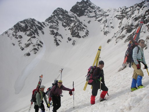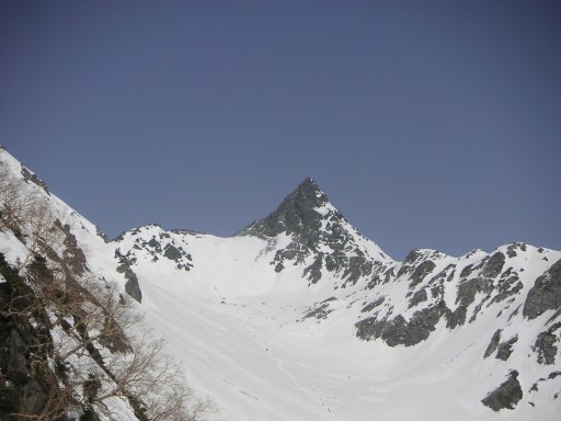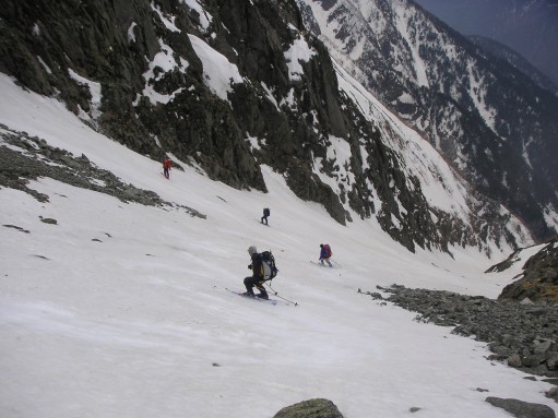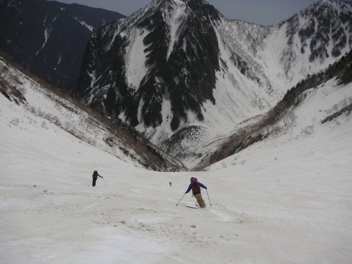 ザイテングラードの登りはアイゼンを着け、踏み固められたステップを登る。白出のコル(奥穂高山荘)にスキーをデポし、奥穂高岳をアタック。ジャンダルムが雄姿で迎えてくれる。登路、雪は殆どついておらず夏道同様に梯子・鎖を使った。白出のコル直下は雪がついていないため100m程下った地点から滑降開始。谷はあまり広くないが、上部はデブリ少なく、快適に飛ばせる。大滝は、夏道を使い30分程の高捲き。天狗沢出合からその下のゴルジュ地帯はデブリに阻まれ滑り難い。下部は河原状になり、難なく蒲田川林道へ。蒲田川林道もしばらくはスキーで下れた。蒲田川は春の芽吹きが始まったばかりの様子であった。