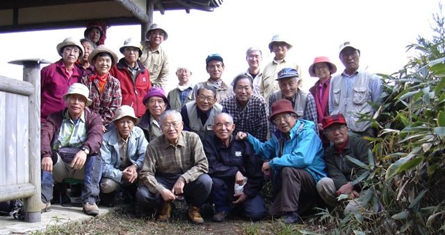 10月30日は予想通り朝から晴れ、午前8時半バスで宿を出発し駒の尾山登山口着は9時。折から色付き始めた林間の坂道を、カサカサと落葉の音を立てつつ歩く風情は秋そのものである。緩やかな尾根道をたどる内に、10時半頂上に到着。全員で記念撮影の後、後山まで歩く組が先発した。早歩きで11時過ぎ船木山通過。後発隊は県境尾根をのんびり歩いたが船木山着では僅か10分の遅れ、それではと薮内とご夫人3名が後山へと先発隊を追い駆けた。先発隊は後山山頂12時着、後発の追い駆け組も追いついて全員16名で岡山県の最高峰、後山からの眺望を楽しんだ。船木山に戻り後発隊と合流、昼食を終えたものから2組に分かれて下山。急な坂道に膝の負担に耐えつつ、午後1時半過ぎには全員下山、出迎えたバスで再び「あわくら荘」へ帰りついた。温泉で汗を流した後、解散前のビールの乾杯。これも公共交通機関利用の余得か。予定のコースを踏破した満足感に座は大いに盛り上がり、最後に中島ドクターから、「65歳を過ぎたら、山中での転倒防止のためストックは2本使用を推奨」とのご発言を最後に解散となった。