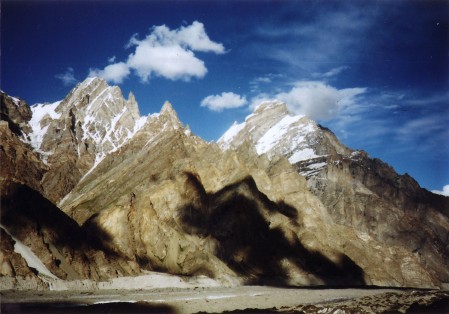 ビアフォー氷河の両岸には、数多くの6,000m台の未踏の無名峰が連なって聳えている。