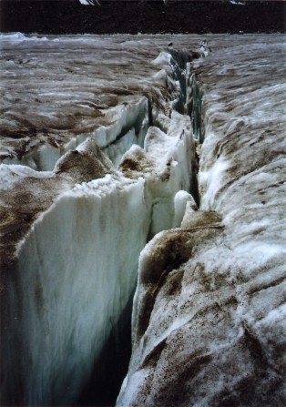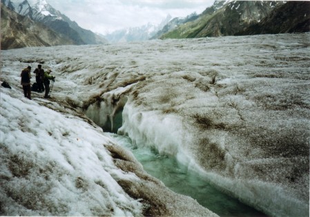 ビアフォー氷河は、幅の広いところでは3-4kmはあろうか? 遠くから眺めると、まるで車で走れそうな舗装道路のように見えるが、歩いてみると無数のクレバスが走っており、氷河の表面には昼中は清い水が勢いよく流れている。