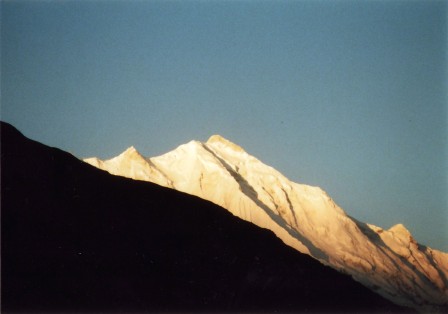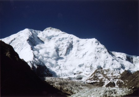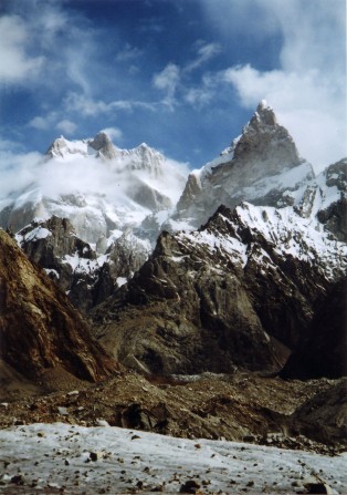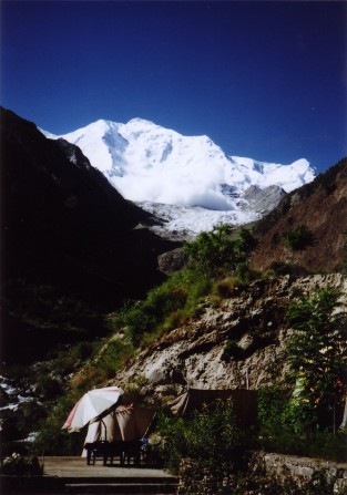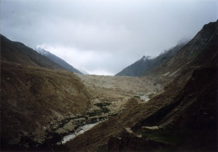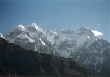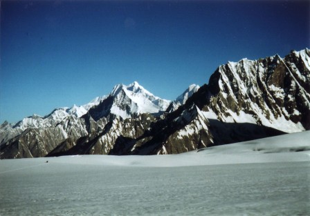 クンヤン氷河を渡りきった少し下流から、クンヤン・チッシュ主峰7,852m、南峰7,620m、西峰7,350mの人を寄せ付けないような厳しい山容が前山の向こうに頭を覗かせていた。