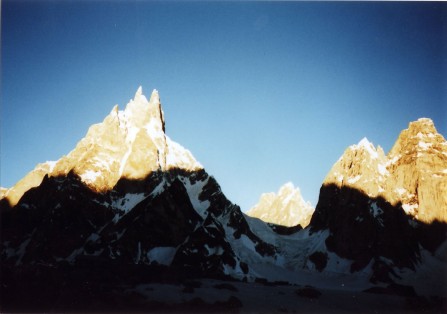 BCからは、フンザ・ピーク6,270mの下に聳える針のように尖った岩塔レデース・フィンガーが望まれる。山崎彰人さんのレリーフを持って翌年追悼にきたパートナーの松岡清司さんが、山崎夫人達と別れた後一人でレデイース・フィンガーを登りに出かけ、岩雪崩で不幸にも亡くなられたらしい。何か、人間の運命のはかなさを感じさせられる。
