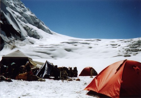 スノーレイクからヒスパー・パス5,151mへは、斜度20-30度ぐらいの割と緩い傾斜の3−4段になった雪の斜面。昔、今西錦司さんがテレマークで峠から滑っておりたという。スノーレイクにテント設営後、10時45分に出発して、ガイドと隊員2名で、運動靴のポーターの為に、その日のうちに5,000mまでトレースをつけた。雪はしっかりしまっており、キックステップで靴が少し沈む程度の最高の状態。標高5,000mまでの傾斜のきつい核心部までトレースをつけることが出来、明日の峠越えの見通しがほぼついて、午後2時にテント地に帰着した。