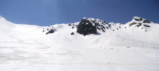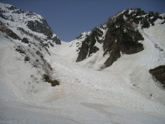 池の平小屋からの小黒部谷の滑りは広い急斜面で良さそうに見えたが、雪質が今一で滑りはさえなかった。大窓谷出合で別れた。出合から見上げると、大窓には大きな雪庇が張り出していた。