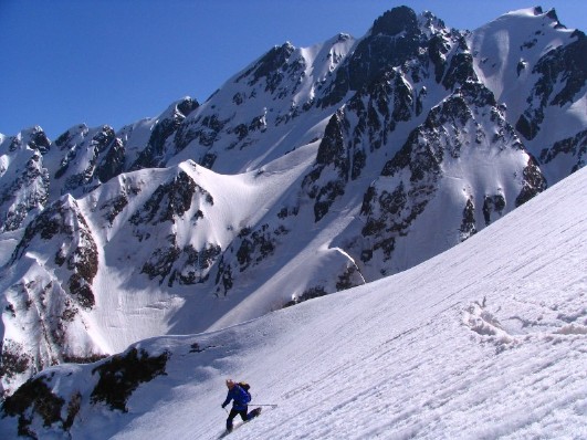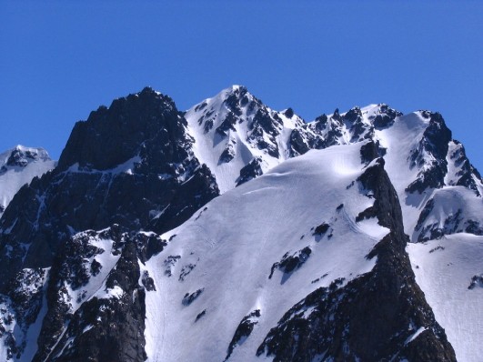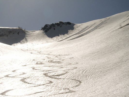 ハシゴ谷乗越までシールとクトーを使って登り、半分陽が当たった沢を剣沢まで滑り降りた。陽の当たらない部分は硬くクラストしており、滑りにくい。剣沢は大雪のため二股までほとんど割れていない。二股から三の窓を見上げると八ッ峰とチンネが素晴らしい。二股を小窓雪渓に入り平の池までシールで登るが、周りからのブロック雪崩れが怖い。平の池にテントを張ったが、ここは別天地である。八ッ峰の展望台で、良い写真が撮れた。景色を堪能した後、池の平山を往復した。標高差500m。池の平山の東面はスキーで滑るには素晴らしい斜面である。しかもシュプールは見当たらない。頂上は北方稜線、小窓尾根を登る人が良く見えた。チンネ、八ッ峰も真横に見え素晴らしい景色であった。展望を満喫し頂上から滑り降りる。途中急なところで重い雪が雪崩れたが、すぐに止まり特に問題は無かった。ほぼ均一な傾斜で広い斜面が続く。大きなパラレルですっ飛ばす。気持ちが良かった。あっという間にテントサイトに着き、一休みの後で仙人山へ向かった。仙人山では黒部側から登ってきた二人組とすれ違った。無木立の斜面にはシュプールは全く無かった。ここも良い滑りができた。テント地から二山のシュプールを眺めて皆で悦に入った。