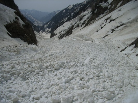 出発7:40−池の平小屋7:50−大窓谷出合8:30−大窓12:20〜40−西仙人谷出合13:40(デブリが谷を埋め、スキーを担いで歩く)−1980年ルーム遭難地点14:30−馬場島15:15 タクシーで富山へ