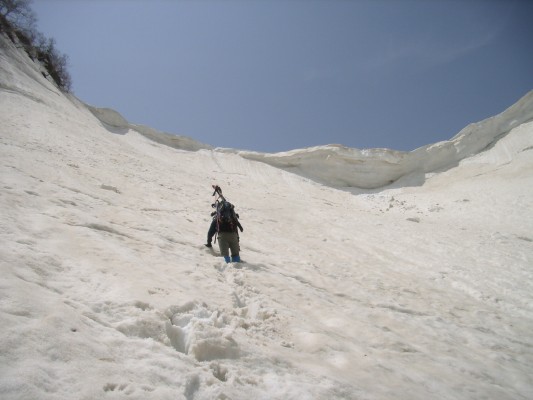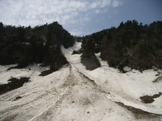大窓谷出合から小黒部谷を下ったが、すぐにデブリが激しくなり、スキーはつまらなくなった。仕舞にはスキーを担いで歩く破目になり、時間を食った。折尾谷が近づくと谷が割れだして、崩壊寸前のスノーブリッヂを渡ったり、スキーを担いでの高巻き、へつりなどが連続した。折尾谷出合手前で沢が激しく割れて、ついに通行不能になりスキーを担いでの大高巻となった。左岸を70mほど上がると段丘となる。大きなブナが生えた平らな台地がありそこを伝って折尾谷へ入った。折尾谷を台地上から眺めると下流の出合付近の積雪は以前よりも少なかった。折尾谷をブナグラ乗越までシールでひたすら登る。少し風が吹いて暑さをやわらげてくれた。ブナグラ乗越で整地してツエルトを張った。夕方、局部的にガスが発生した。