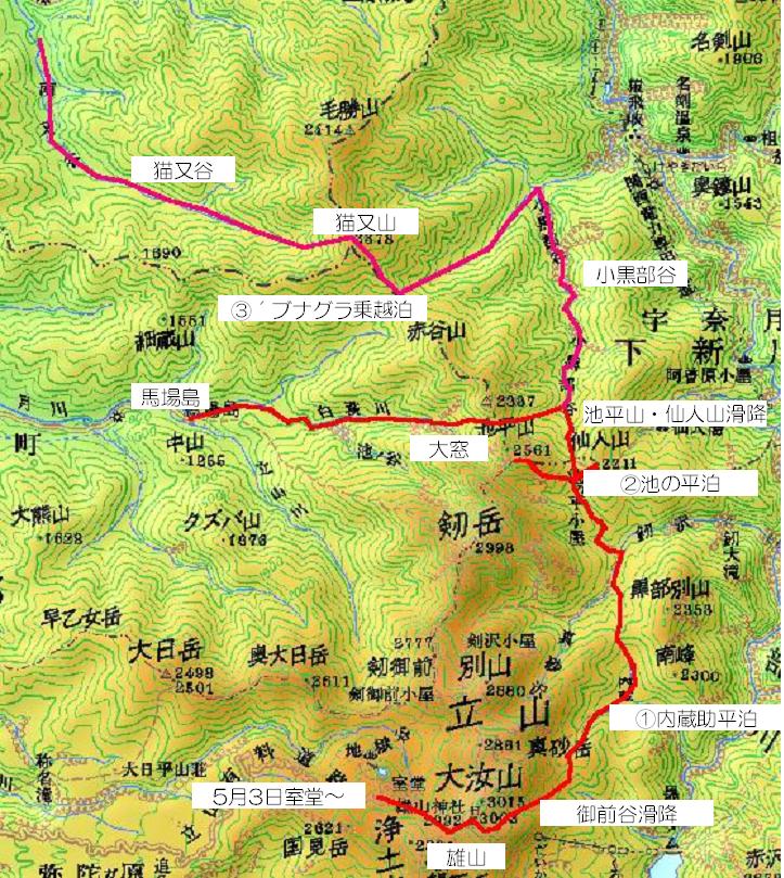 6日:ブナグラ乗越〜猫又山〜猫又谷〜南又谷〜魚津