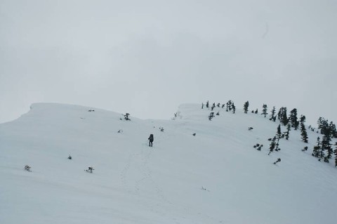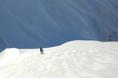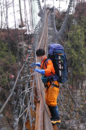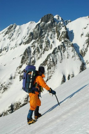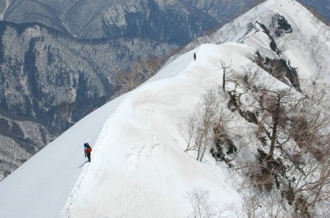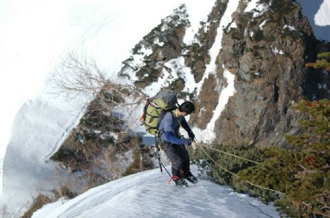 吊り橋を渡り、河原で水を汲んで鉄塔下流側の長いルンゼに取りつく。ガンドウ尾根下部は急峻で細い。荷物が重いので辛い。去年の同時期は結構な藪こぎがあったと言うが、本年はほとんど藪こぎなし。どうしても藪に入らなければならなかったポイントはせいぜい二、三箇所。ときおり底雪崩が地響きをたてて落下するので、尾根線を登高できるのはありがたい。小雨がぱらついたのを潮に1700m付近のコル状を整地して幕とする。夜半、えらい雨と雷。風がそれほどでもないのに救われるが、エスパースの布地越しにも閃光がきらめくのを見て、ここで泊にしておいてよかったと思う。