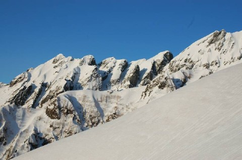 今日は天気が完全に回復してドピーカン。アイゼンをきかせて池ノ平山を登っていく。剱の主稜線はアップダウンが強烈である。せっかく立った池ノ平山もすぐさま200mばかり下らなければならない。急峻な傾斜にたまらずザイルを出す。コルから、またいきなり急上昇。小ポコを越えて小窓の王の下降。雪がびっちり着いているおかげでクライムダウン可。ここまで来れば本峰はすぐそこ。程なく人だらけの狭いピークに到着。ここも雪が厚く、祠など影も形もない。2600mのコルに異様に整備されたテン場後をめっけ、あっさりとひよる。