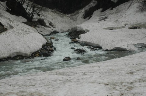 本日はただボーっと下るのみ。とは言っても、腐れ雪の中を歩くのはまっぴらなのでちょっと早めに。伝蔵小屋で熊岩からIV峰に行くという静大の三人pと会う。高度を下げるにしたがって春の雰囲気が濃くなってくる。上部ではまったく感じられなかった土の臭いまで。尾根最下部ではカタクリがうす紫色の花をつけて群生していた。