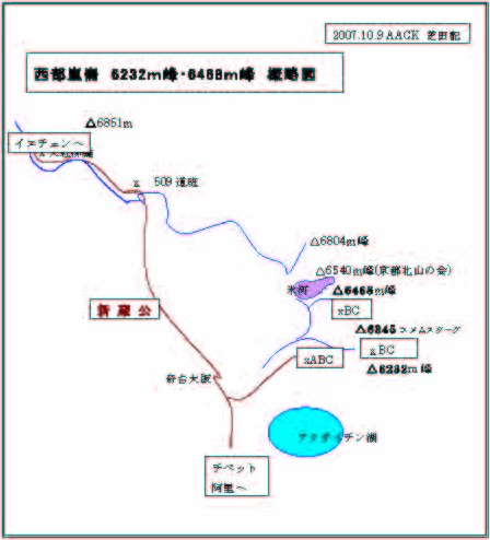本峰は2000年京都「北山の会」が遡行し初登頂した6540m峰と氷河を挟んで南東に聳える峰。