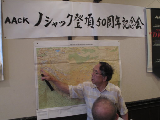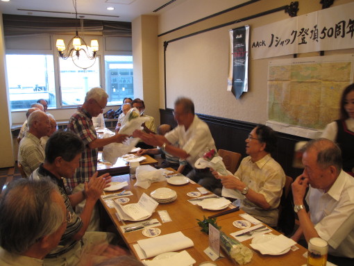 AACKノシャック遠征隊が1960年8月、初登頂を果たしてからことしで五〇年を迎える。そこで当会有志22名があつまり、8月11日京都の朝日ビヤホールで初登頂記念会が催された。上田豊会長の挨拶、斎藤淳生氏の音頭で乾杯のあと、広瀬幸治、酒井敏明、岩坪五郎各隊員の話に華が咲いた。五〇年たって明かされた裏話や、ポーランド隊から分けてもらったブタンバーナーのお礼に添付した「ショパンの国から来た同志へ、サクラ咲く国からきた二人のボーイズより」という粋な手紙の自画自賛などにぎやかなひと時であった。この9月には、同時に登頂をめざしたポーランド遠征隊の存命隊員との交流が再現して、登頂隊員の酒井、岩坪氏を中心とした15名の交流団がポーランドを訪問することになった。ひとつの遠征の縁を50年たっても持ち続けることが出来る当会の奥の深さがあらわれていよう。この訪問記は次回に掲載する予定。