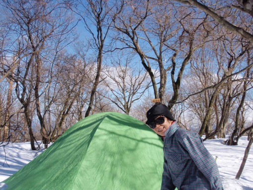 桜谷山の広い頂上にテントを設営後、永田さんと私が木地山峠への降りるルートを偵察。夏道の標識が立てられているところから、急傾斜の尾根を左手に巻き気味にトラバースして、百里ヶ岳北尾根の稜線に出る。強風で雪がクラストして凍結しているので、アイゼンをつけてロープを使ってルートを偵察した。快適なテント場に戻り、2時半頃から、翌日の飲み水を作りながら、焼酎、ウイスキーで雪見酒。夕食の終わる6時半頃には、4人ともアルコールですっかりご機嫌になり、7時頃に早々と就寝した。夜中に、時々強風で木々がゴーゴーと音を立てていたが、われわれのテント場はまったく強風の影響を受けず安眠出来た。