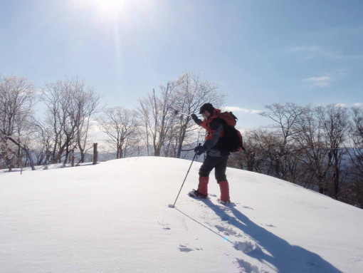 木地山峠から百里ヶ岳は、約300m足らずの登りだが尾根筋も割りと広く歩きやすい。雪は堅くしまり殆どもぐらず、私の6本爪で快調に歩ける。傾斜が少しきつくなってくると、キック・ステップで登る。降雪直後の深雪の時は、恐らく膝までもぐるワカンのラッセルになるだろうと想像しながら、今日の最高の積雪条件に感謝。太陽が姿をあらわし、木の間越しに百里ヶ岳頂上付近の木々が樹氷にキラキラと輝いて見える。