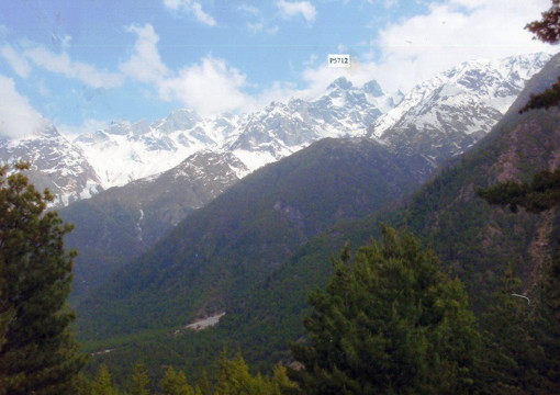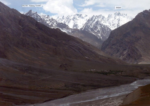 Langiaから、対岸のRatang River の奥のP6170 (Ratang Tower)からP6060の稜線が遠望される。Ratang Towerは1993年に、インド隊(Haris Kapadia隊長)が初登頂した山だ。