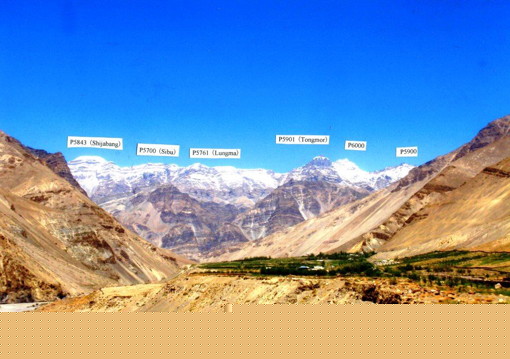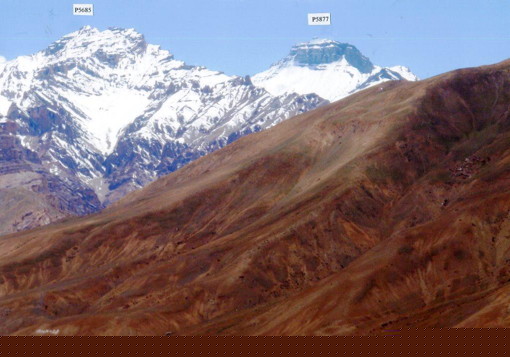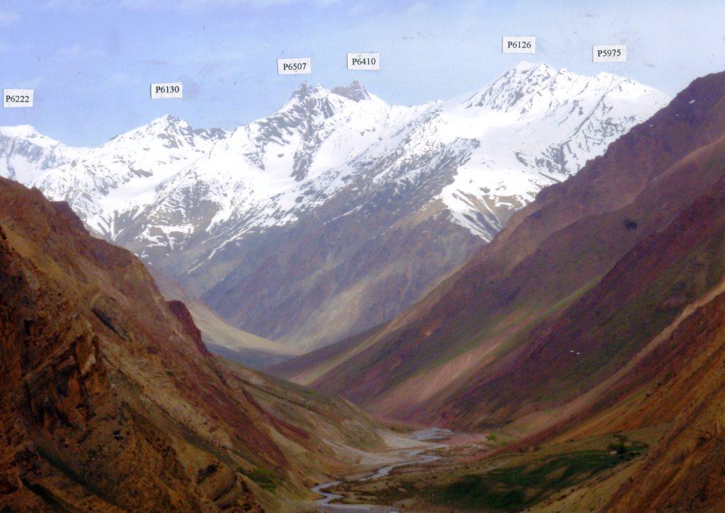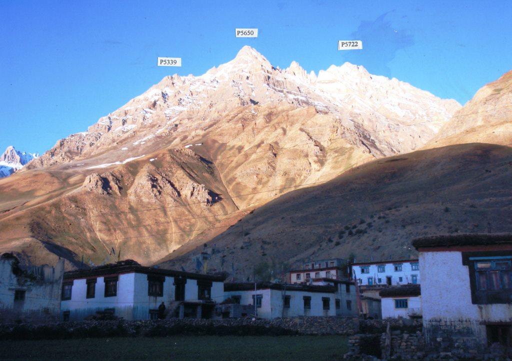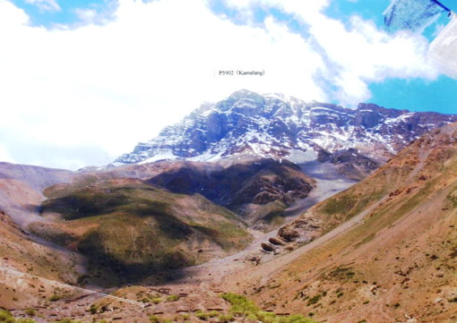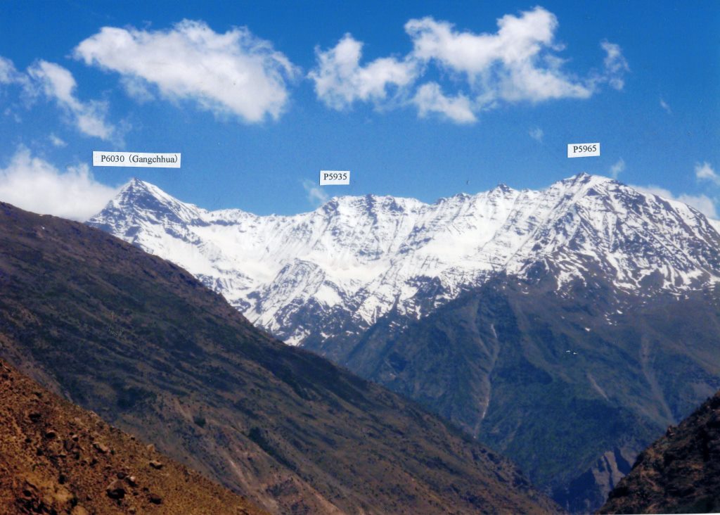 Kaから南を眺めると、支谷のTiang Lungpaの右岸の山々であるP6030 (Gangchhua), P5935, P5965の連山が望めた。P6030 (Gangchuua)は、1992年にインドArmy隊が初登頂。