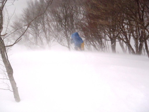 前日からの風雨は夜中になっても止まず。朝方になって4時ごろから、雨が小雪にかわりだした。相変わらず風も強く、ガスで視界も悪い。テントを撤収する時も、テントが吹き飛ばされないように、神経を使って撤収した。