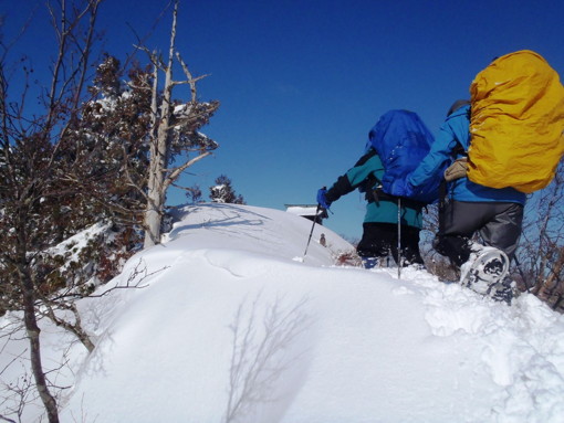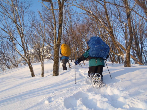 4ピッチ目は、樹林の間の凸凹の多い狭い雪稜を登り、ようやく荷物を下ろせるような安定した広い稜線にでることが出来た。ワカンをはいたままでの雪と岩のミックスの岩稜登攀は、バランスの悪い私には、結構怖い疲れるピッチであった。