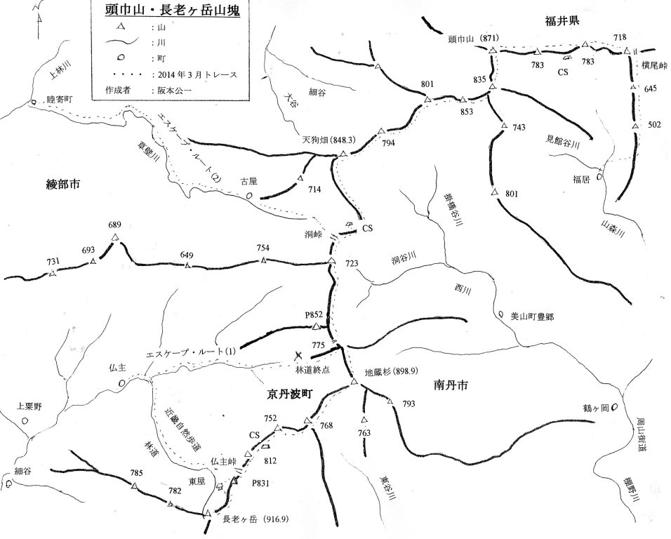 京都府南丹市美山町と綾部市及び福井県名田庄村にまたがる標高871mの頭巾山(ときんざん)から、京都府南丹市美山町と京丹波町の堺にある長老ヶ岳(916.9m)へ、2014年3月10日から実働4日、予備2日、最終下山日3月15日の予定で、積雪期縦走に出かけた。