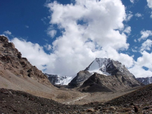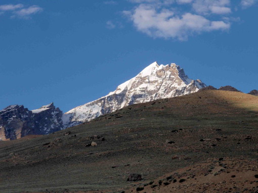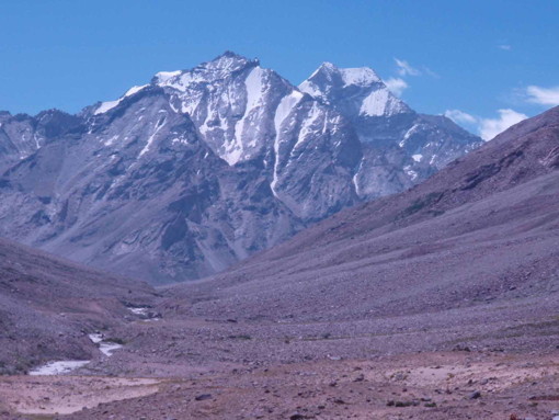 「山容と地形」ダルチャから西北に入っているジャンカル谷の奥の山。ザンスカール・スムドのすぐ上流で北に入るバグラック谷(Bagrac Nala)の流域の山。