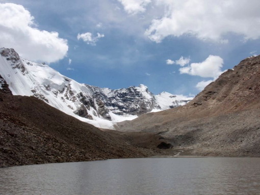 「山容と地形」レナック谷右股には三つの氷河があるが、最初の第一氷河の奥にある純白の山がP6165 (L10)である。第一氷河の手前に小さな湖があり、その下の広い台地が快適な素晴らしいBCとなる。
