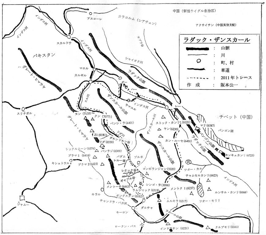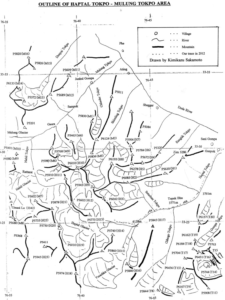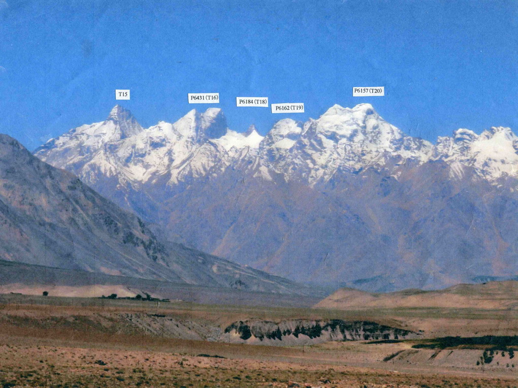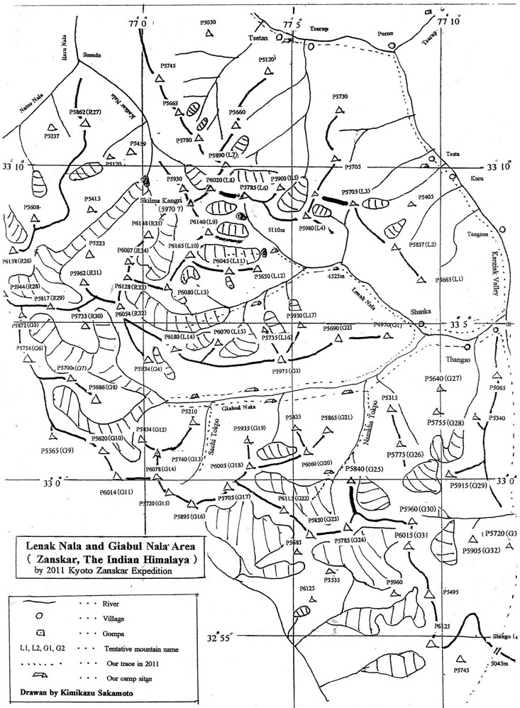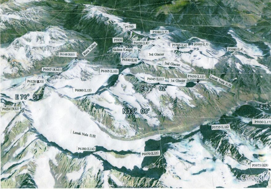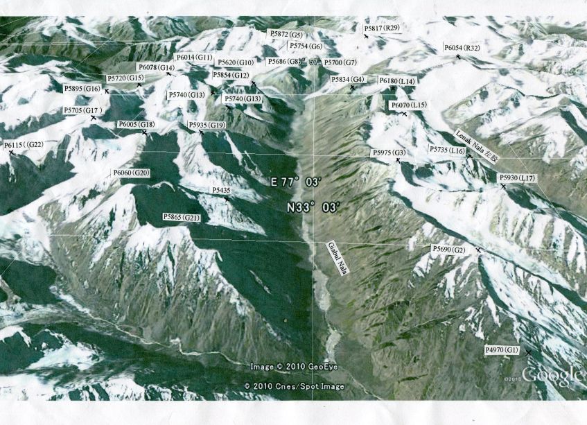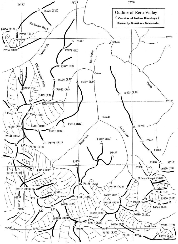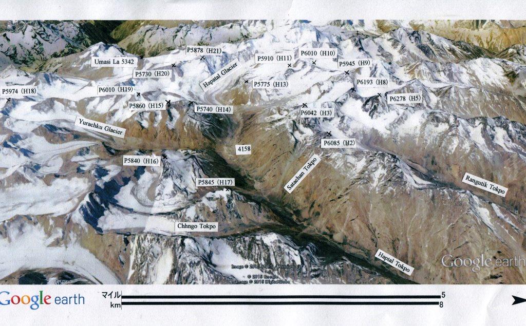 (注)* P5845(H17), P6070 (L15), P6071(R1) のように表記されているH17, L15, R1等の記号は、無名峰の同定をしやすいように、京都ザンスカール未踏峰踏査隊がつけたものである。ハプタル谷、ゴンペ谷、テマサ谷、レルー谷、レナック谷、ギアブル谷で探査した山々には、全て上記のようなアルファベット記号をつけた。