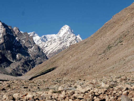 「山容と地形」ペンジ峠 (Pensi La)の北側のZ2氷河(Pundum Glacier ともよばれている)の奥にあるピラミッド型の鋭峰。