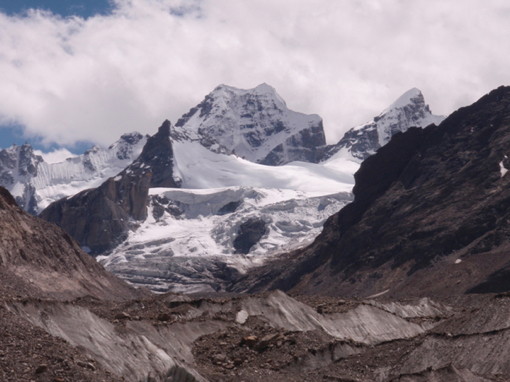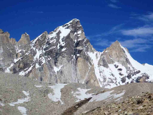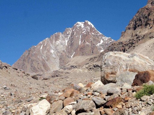 「山容と地形」右股ハプタル氷河の氷河舌端の奥にある岩山がP5775(H13)である。この山で氷河が左右にわかれる。