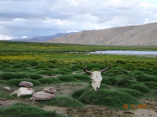 ツオー・モリリの東岸を北に歩き、岬の向こうのPabuk 迄ハイキングに出かけた。パシミナ・ゴートの放牧小屋の囲いがいくつかあり、最盛期はゴートがこのあたりで放牧されている事が解った。Dungri からこのあたりまでは、ツオー・モリリの最南端がくびれたような小さな湖が幾つも連なっている、まるでパラダイスのような実に景色の素晴らしい草原地帯であった。南を振り返ると、Parang ChuにあるP6367 やP6364が望まれた。