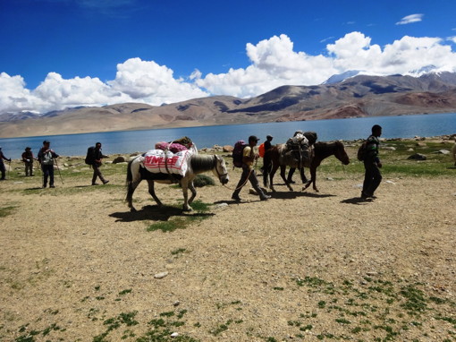 | Tso Moriri from Karzok village (by Mr. Ito ) | Trekking with horses (by Mr. Ito ) |