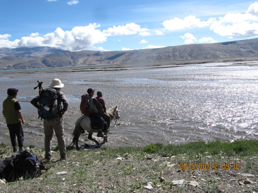 ツオー・モリリ西岸のトレッキング道には通常は渡渉が全くない筈なのに、数日前の豪雨の為か、湿地帯に小川が何本も流れていた。膝より深い急流の箇所もあったので、馬方に頼んで馬に乗せて貰って渡渉(8:20am)。小林悦子さんが馬の上でバランスを崩し川に落ちかけたが、馬方のナムギャルが彼女を抱えてくれ事なきを得たハプニングもあった。