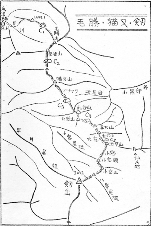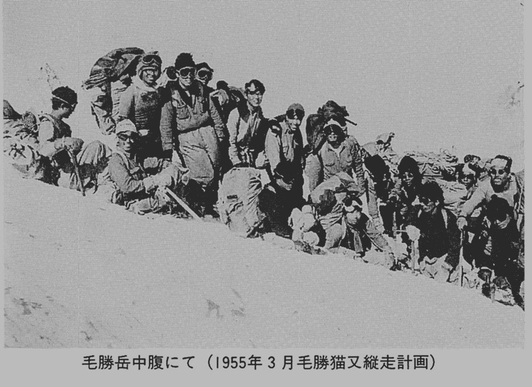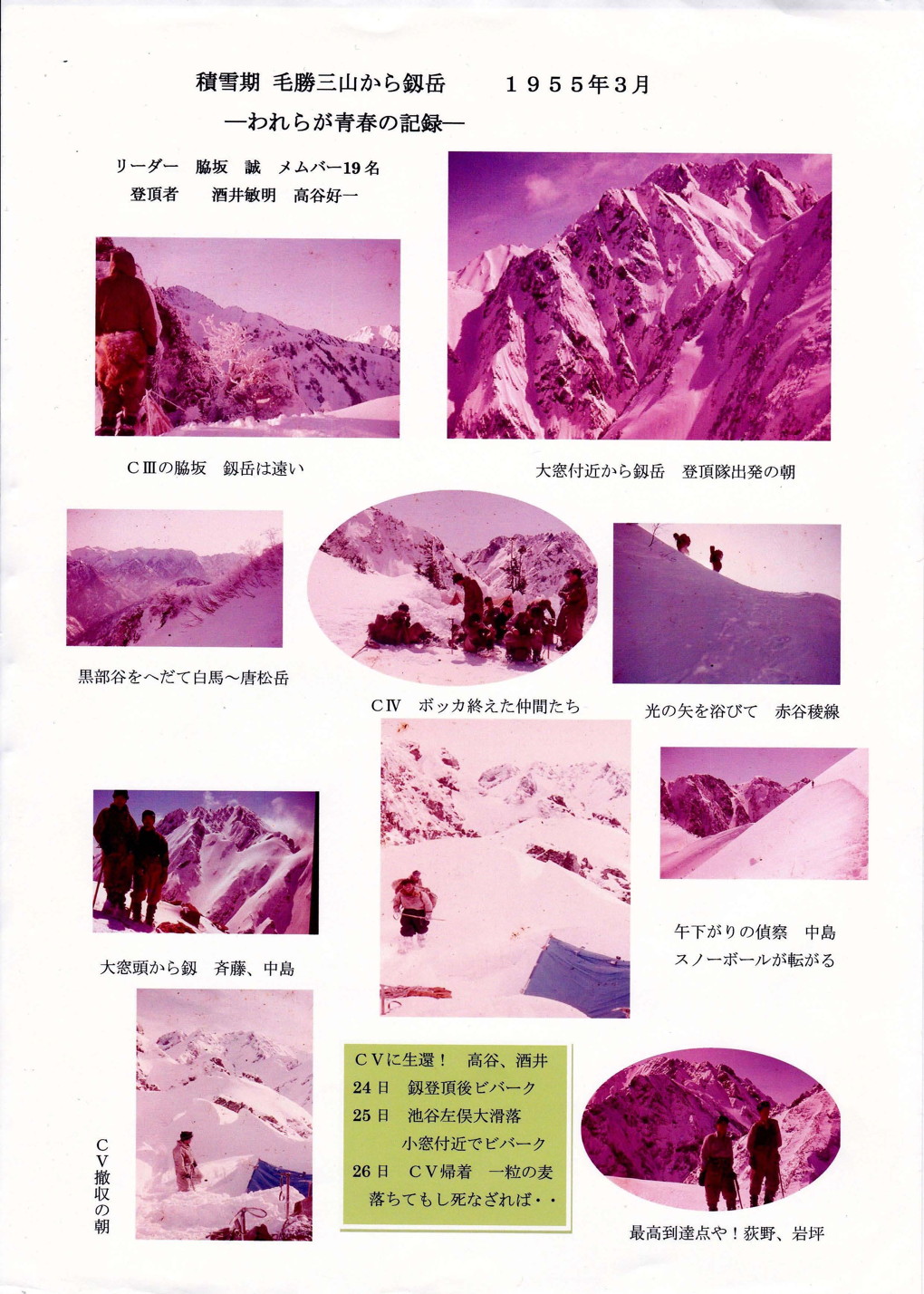 昭和二十九年四月私とOB平井とで毛勝から剱岳のラッシュによる計画を立て昭和三十年三月実行することにしていた。同時に現役の長老?(かれらは医学部学生なので六年間部生活をした)リーダ斎藤、中島(道)が部生活の総決算として同じ計画をやる気持のあることを聞き、前記OB二名と現役部員とが合流してこの計画を行う事とし、方法としては極地法による事にした。