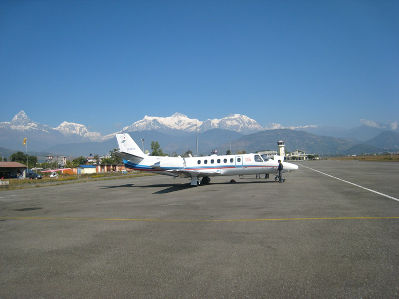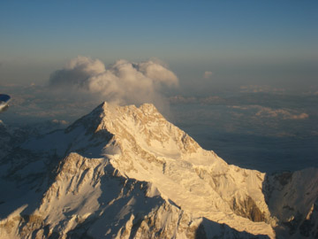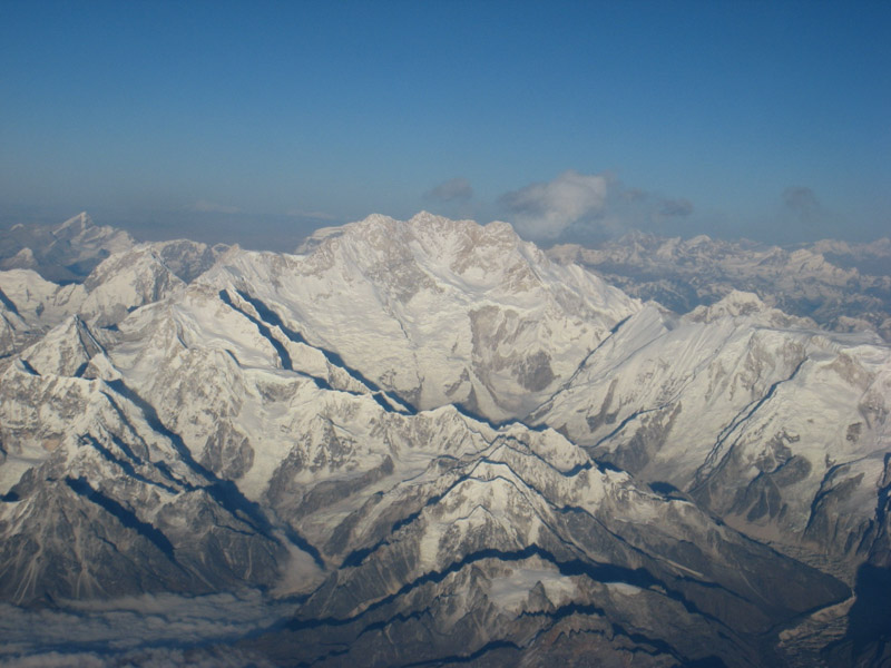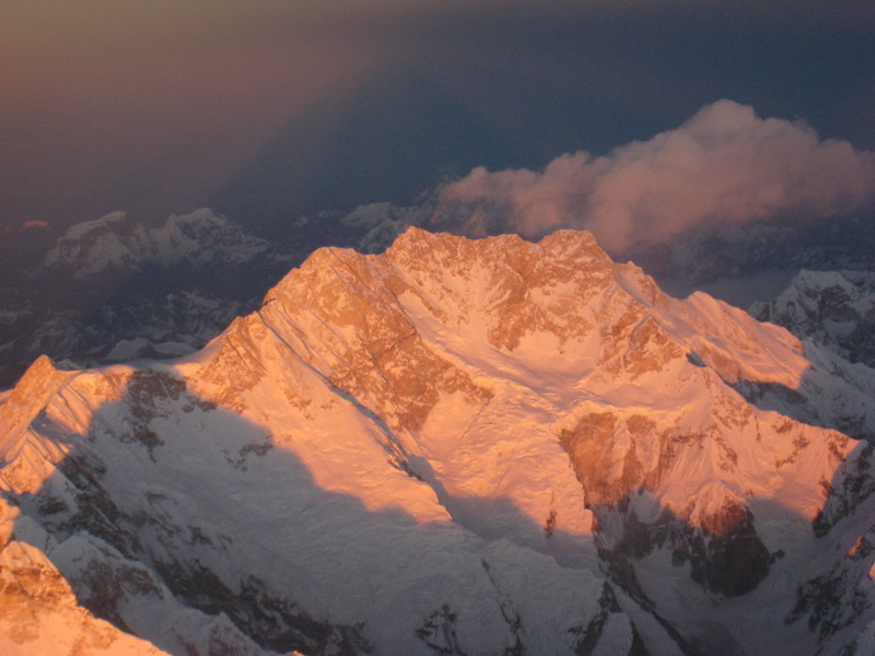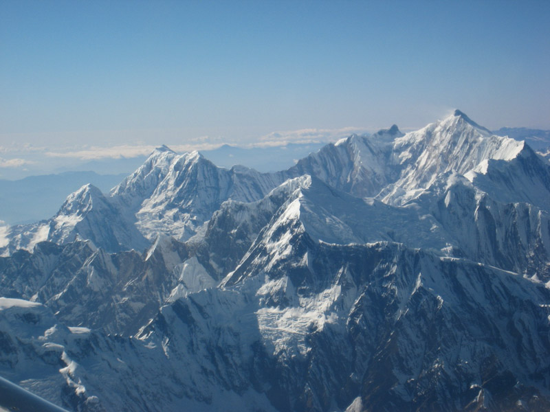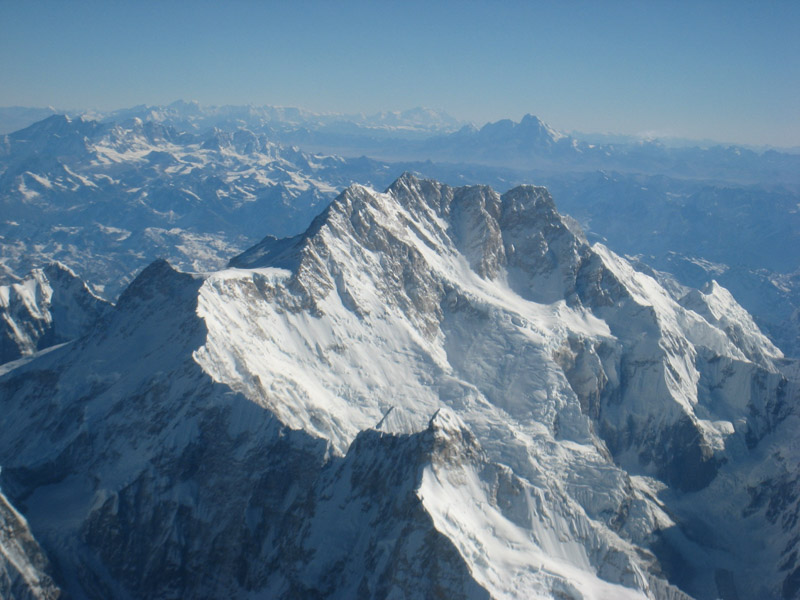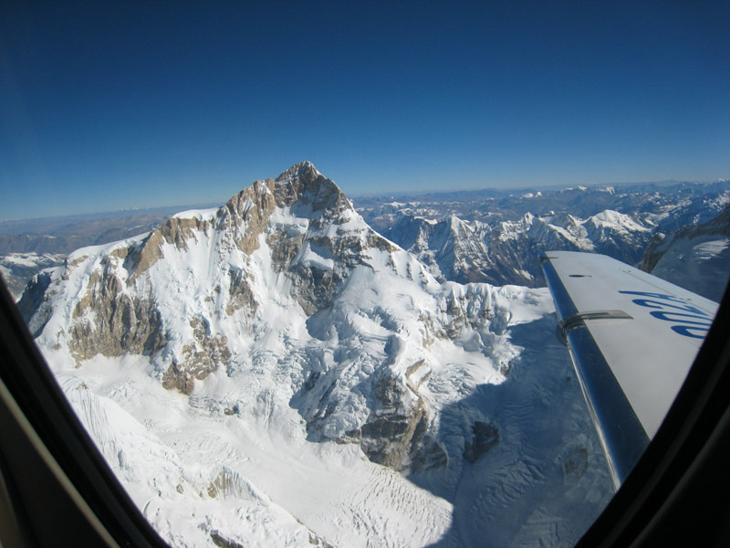 空撮には70年代の当事者として、名大を定年退職したばかりのわたしが加わることになった。70年代の研究目的のフライトは、好天の午前中だけ飛んだ。今回の飛行はベテランの関口博之機長ら4人の日本人クルーにより、得難い撮影ショットを求め、姿をかえる峰々へ時刻をかえて繰り返し飛んだ。夕暮れのヒマラヤ上空で旋回しながら、光線の変化を追った。カトマンズ上空に戻った時には暗くなっていて、滑走路両脇の灯列に導かれて着陸したこともあった。